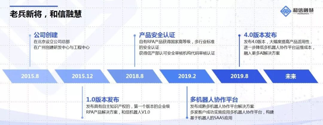 2015年12月,和信发布了具有自主知识产权的第一个机器人产品-和信机器人1.0,自此以后基本按照一年一个大版本的节奏发布新版本。2017年年初发布了2.0版本,2018年年中发布3.0版本,2019年8月份发布了4.0版本。值得注意的是在2018年8月份,和信与具有信产部认证资质的安全审核机构合作,获得了国家高等级多行业标准的安全认证。今年年初和信还把3.0版本的代码交给具有国家认可的安全机构,进行了一个全面的代码审核,来确保和信产品在架构、功能、代码各个层级都能够为用户提供最高等级的安全服务。