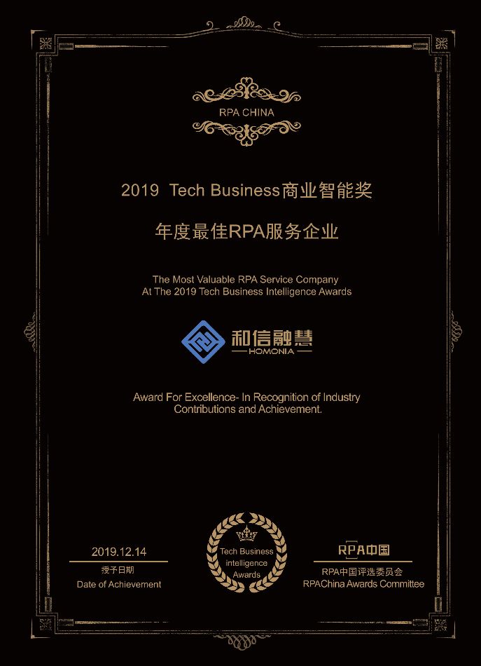 在12月14日结束的“RPA中国2019 Tech Business商业智能大会”上,作为国内最早一批专注于企业级RPA解决方案研发与实施的和信融慧斩获“年度最佳RPA服务企业”大奖。同时,和信融慧创始人兼CEO李程先生在大会上发表了题为《RPA行业老兵-和信融慧,来了》的精彩演讲。