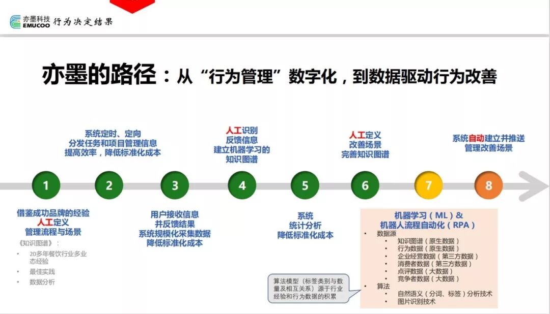 亦墨在为某国际品牌餐饮连锁企业开发数字化运营管理系统时,客户提出了一个要求,希望系统能够将发现的问题直接转化为改善任务的指令。这就是一个系统流程自动化的问题,就是RPA。之前,亦墨已经累计了多业态餐饮企业经营管理的场景库,给场景打上了几百个标签,离RPA仅一步之遥。但是,这一步是一大步,是一次飞跃。