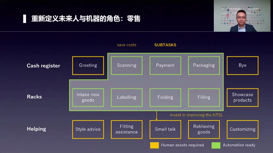 以零售业为例,图中绿色框的内容就是现在已经部分实现、未来可能全部实现的自动化流程。而图中黄色框中的工作内容则尚未实现,包括店员与客户的交流,如在客户试衣过程中,提供一些建议和帮助等行为。这些工作内容在相当长的一段时间内还是需要人工参与才能完成。