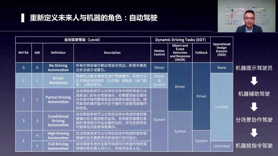 我们可以发现,在自动驾驶层级逐渐向高层级演进的过程中,人类驾驶员在驾驶过程中发挥的作用在逐渐减少,但依旧存在很强的人机互动、人机协作的过程。