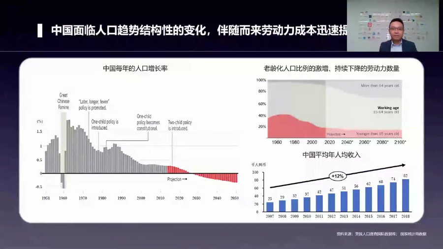从上图可以看到,从2007年开始的十几年里,我国的平均劳动力成本呈现出12%的年增长率。所以对于整个中国而言,人口结构的变化以及劳动力成本的变化,将对各行各业带来极大的挑战。
