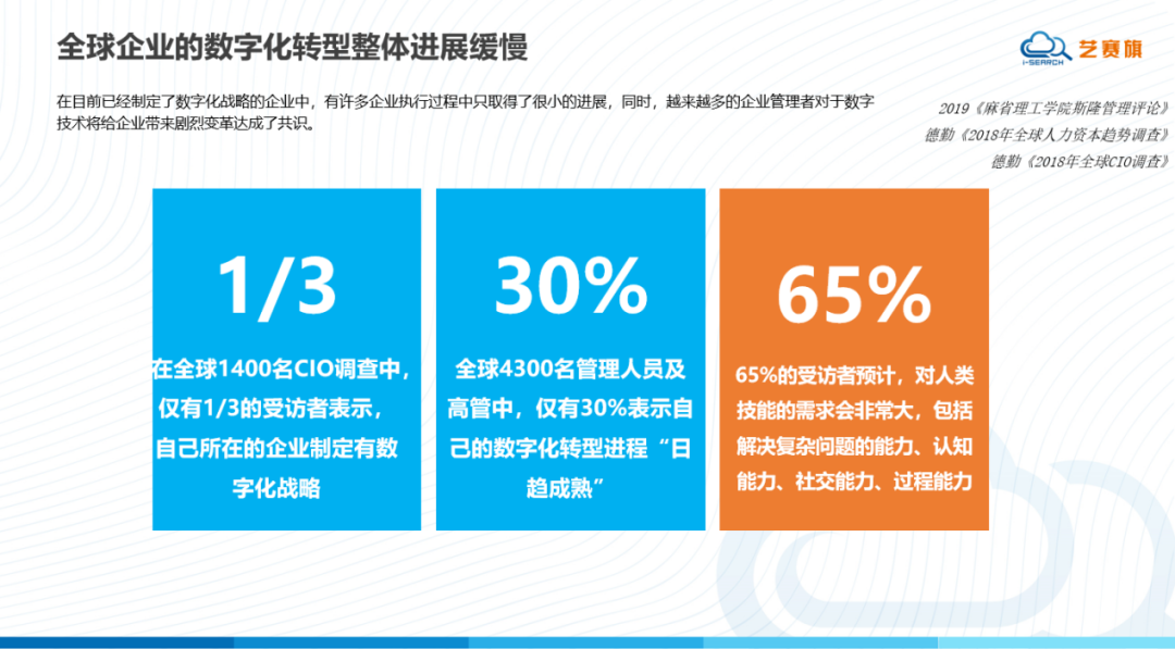 目前,全球企业的数字化转型整体进展缓慢。据调查,在全球1400名CIO中仅有1/3的受访者表示,自己所在的企业制定有数字化战略;全球4300名管理人员及高管中,仅有30%表示自己的数字化转型进程“日趋成熟”;65%的受访者预计,对人类技能的需求会非常大,包括解决复杂问题的能力、认知能力、社交能力、过程能力等。