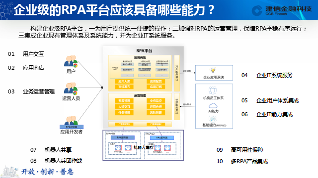 总体来说有三点。一是为用户提供统一便捷的操作;二是加强对RPA的运营管理,保障RPA平稳有序运行;三是集成企业现有管理体系及系统能力,并为企业IT系统服务。下面我将为大家详细讲解一下建信金融平台的能力。