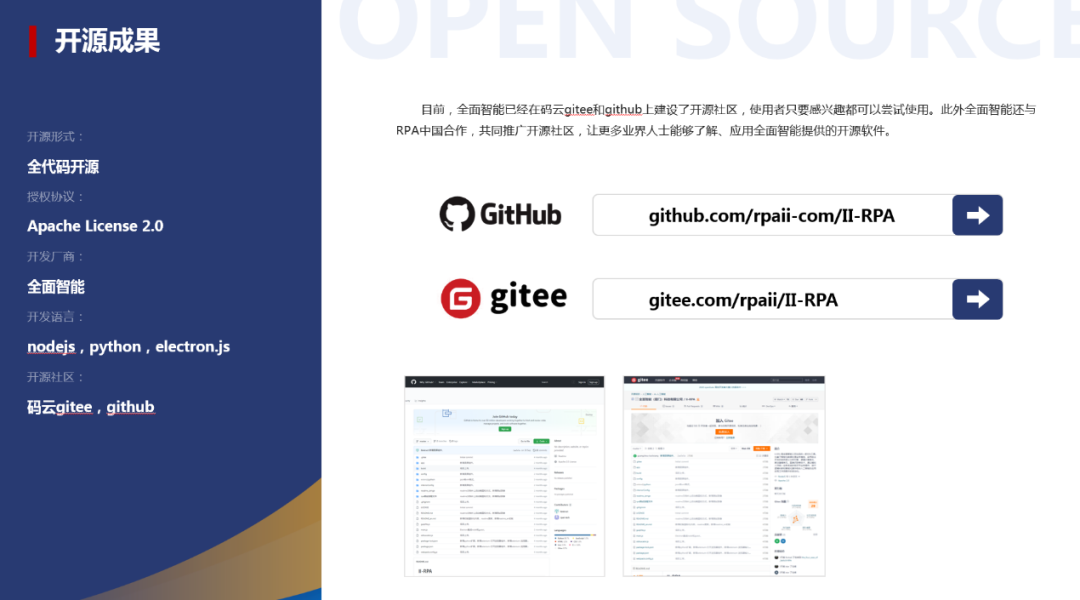 目前,全面智能已经在码云gitee和GitHub上建设了开源社区,使用者只要感兴趣都可以尝试使用。此外全面智能还与RPA中国合作,共同推广开源社区,让更多业界人士能够了解、应用全面智能提供的开源软件。