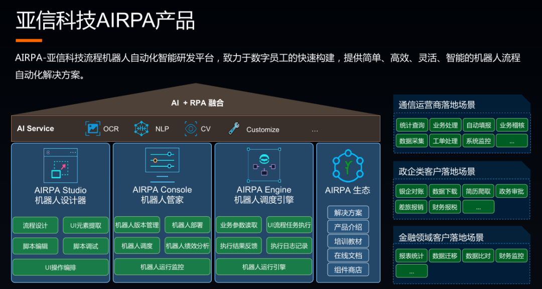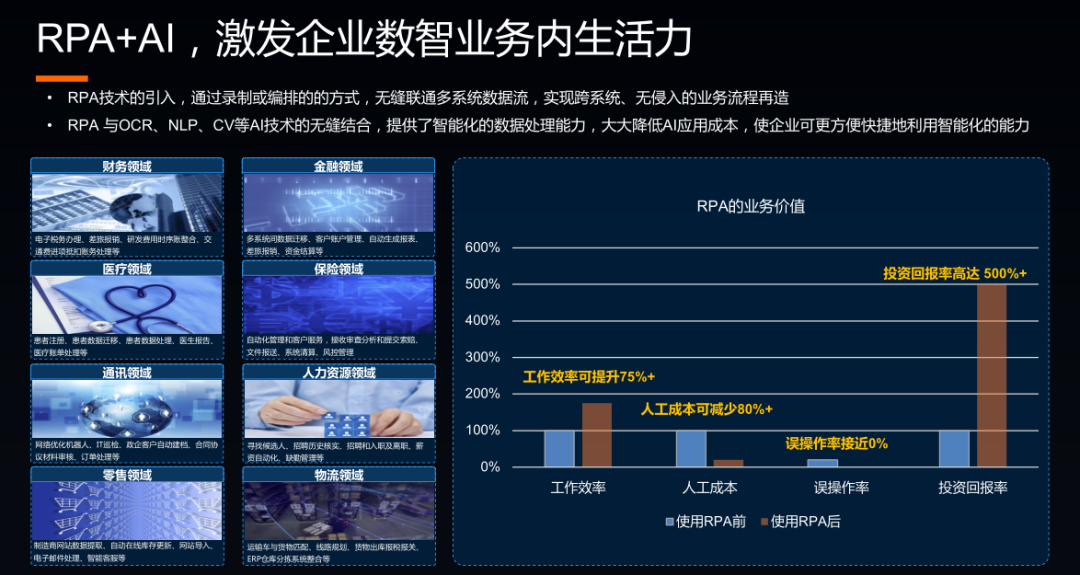 薛浩认为,智能数字化劳动力能有如此大的影响力,主要得益于AI+RPA这套组合拳产品。RPA在AI加持下拥有了看、读、说、写的能力,突破了传统自动化天花板,可将更耗时、费力的非结构化数据业务实现自动化;而RPA为AI技术提供了最佳场景化落地途径,光学字符识别、自然语言处理、机器学习等主流人工智能技术实现开箱即用,免去了过去冗长复杂的部署流程,二者完美地实现了技术层面的互补。