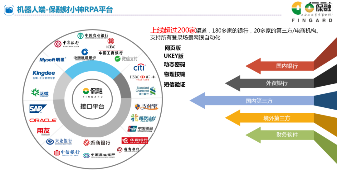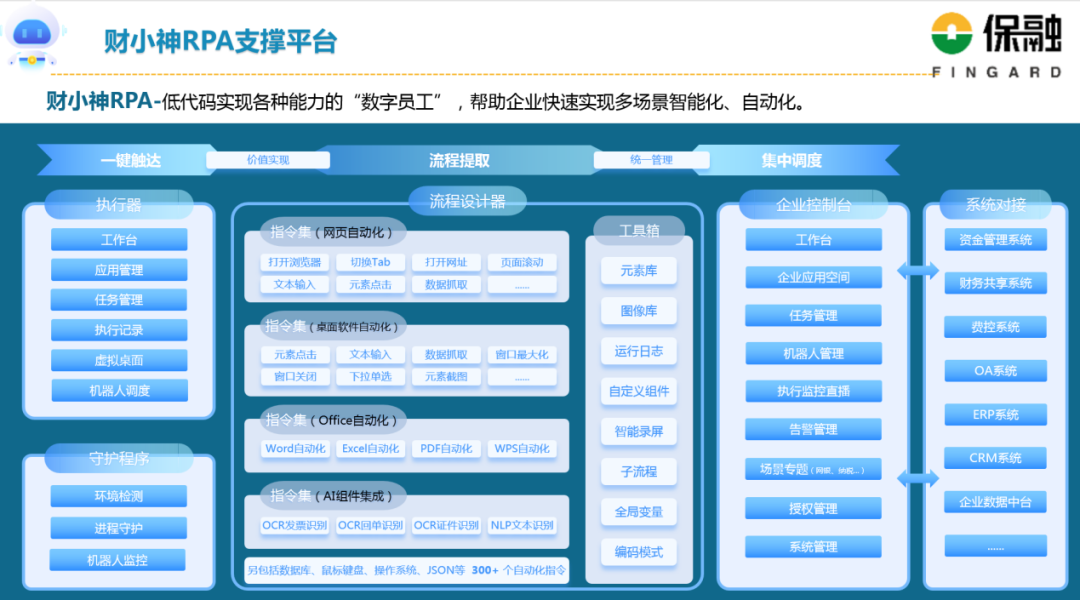 但在企业级RPA场景化落地过程中,客户经常面临RPA使用目标不明确,项目实施环境封闭复杂,业务连接不灵活,自动化流程不稳定等痛点。针对诸多RPA应用难点,保融财小神RPA开发中心、提供多端口融合技术,链接企业与银行、合作方、第三方专业厂商,整合各方业务技术能力,为大型企业提供开放RPA技术平台,解决各类场景下的自动化应用,提高企业数智化水平。